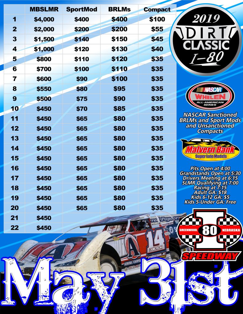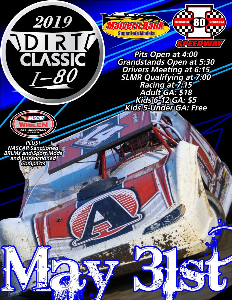 I-80 Dirt Classici802019-05-29T12:53:26-06:00 Friday, May 31, 2019 Adult GA Ticket: $18 Kids 6-12 GA Ticket: $5 Kids 5 & Under GA: Free Non-NASCAR Pit Pass: $30 NASCAR Pit Pass: $30 Pit Gates Open: 4:00 Gates Open: 5:30 Drivers Meeting: 6:15 Racing Starts: 7:00 Q