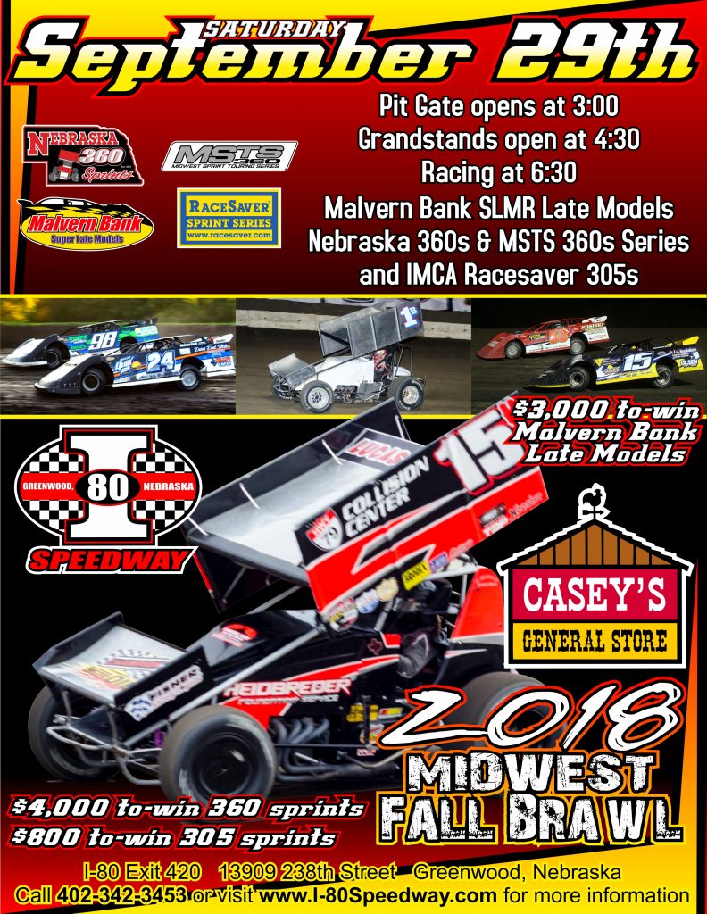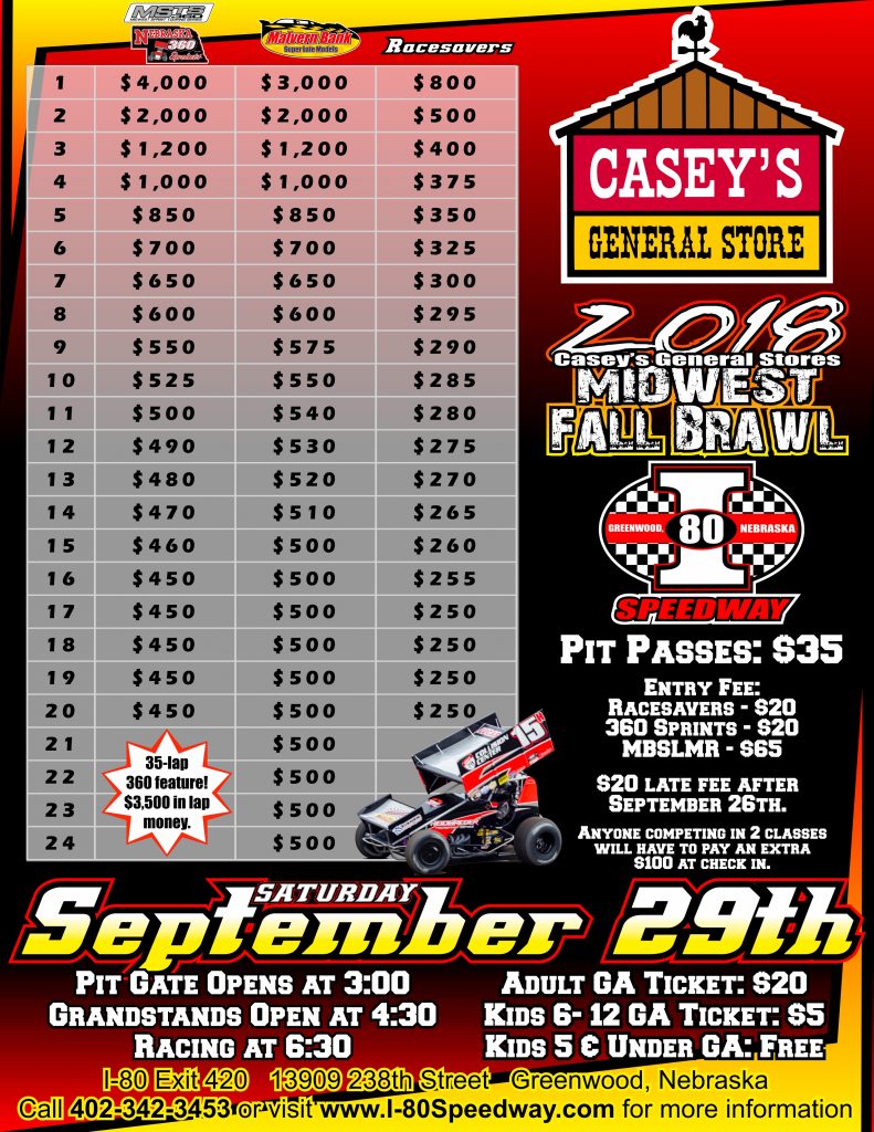 Casey’s Midwest Fall Brawl – CANCELLEDi802018-09-29T11:43:33-06:00 Saturday, September 29, 2018 Adult GA Ticket: $20 Kids 6-12 GA Ticket: $5 Kids 5 & Under GA: Free Non-NASCAR Pit Pass: $35 NASCAR Pit Pass: $35 Pit Gates Open: 3:00 Gates Open: 4:30 Drivers Meeting: Racing Starts: 6:30
